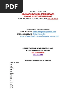 Save income tax 2019 banggawan solman pdf for later cpar business transfer taxes testbank uploaded by zoren de castro. Laws principles and applications solution manual rex banggawan 2017 edition chapter 1 introduction to taxation exercise drill 1. Taxation power state power 2. View test prep bustax answer key from cba 101 at our lady of fatima university.